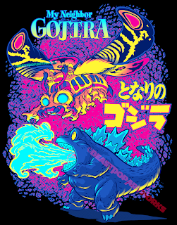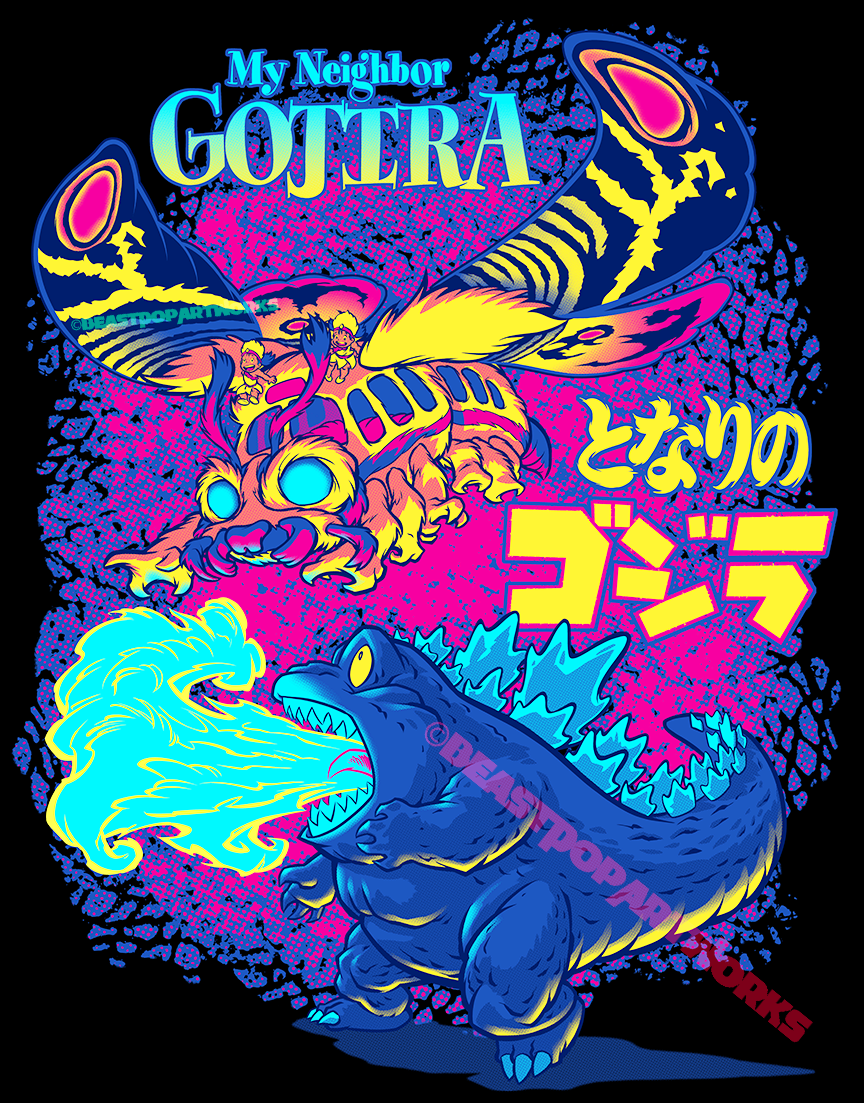 Miyazaki's beloved animated masterpiece "My Neighbor Totoro" meets Japan's baddest kaiju, Godzilla ("Gojira", to the Japanese). I've had this idea to mash together Totoro and Godzilla for some time now, and it just seemed like a perfect fit to also add a Mothra/Catbus into the illustration.
